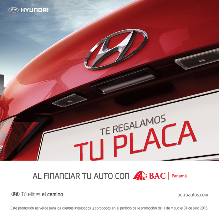 El desembolso del préstamo se debe efectuar hasta el 31 de agosto de 2016. El cliente deberá haber firmado los documentos de aceptación del préstamo de auto y cumplido con los requisitos del mismo para el desembolso. El cliente deberá presentar a la agencia esta carta de promoción original hasta el 30 de septiembre de 2016, de lo contrario queda sin efecto el pago del mismo; liberando a BAC Panamá y a sus subsidiarias de cualquier responsabilidad. BAC Panamá pagará directamente a la agencia Petroautos el costo de la placa hasta la siguiente suma por modelo de auto: EON: $178.16, Todos los I-10: $183.16, Todos los ACCENT $185.16, I20 ACTIVE: $186.16, I-30: $188.16, CRETA: $191.16, ELANTRA $192.16, TUCSON $197.16, SANTA FE $224.16. Aplican todos los modelos de la marca HYUNDAI antes mencionados. No aplica con otras promociones. No aplica para vehículos de la línea comercial o leasing. No es transferible, ni canjeable en efectivo. No aplica colaboradores BAC INTERNATIONAL BANK, INC y subsidiarías. Aplica sólo autos nuevos. Ésta carta no es válida sin la firma autorizada del Banco. |
